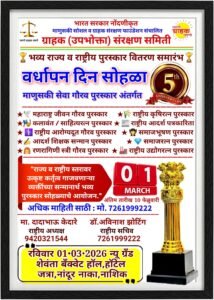 नाशिक : भारत सरकार नोंदणीकृत माणुसकी सोशल व ग्राहक संरक्षण फाउंडेशन संचालित ग्राहक (उपभोक्ता) संरक्षण समिती यांच्या वतीने “जागो ग्राहक जागी” या ब्रीदवाक्याखाली भव्य राज्य व राष्ट्रीय पुरस्कार वितरण समारंभ तसेच वर्धापन दिन सोहळ्याचे आयोजन करण्यात आले आहे. हा गौरवपूर्ण सोहळा रविवार, दिनांक 1 मार्च 2026 रोजी नाशिक येथील न्यू ग्रँड शेवंता बँक्वेट हॉल, हॉटेल जत्रा, नांदूर नाका येथे मोठ्या उत्साहात संपन्न होणार आहे.